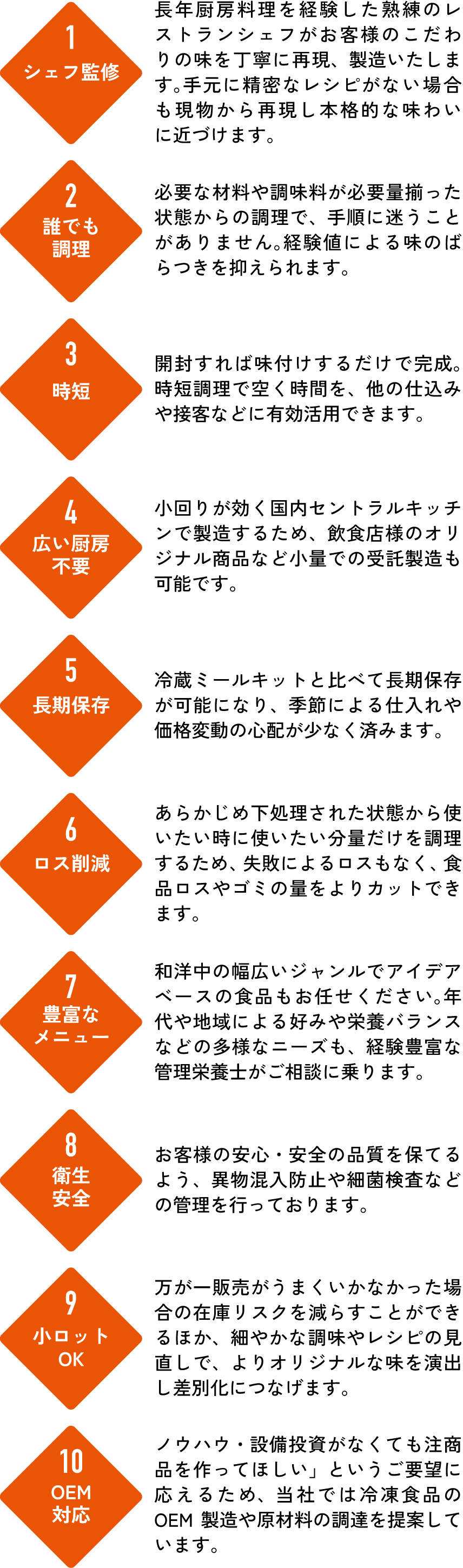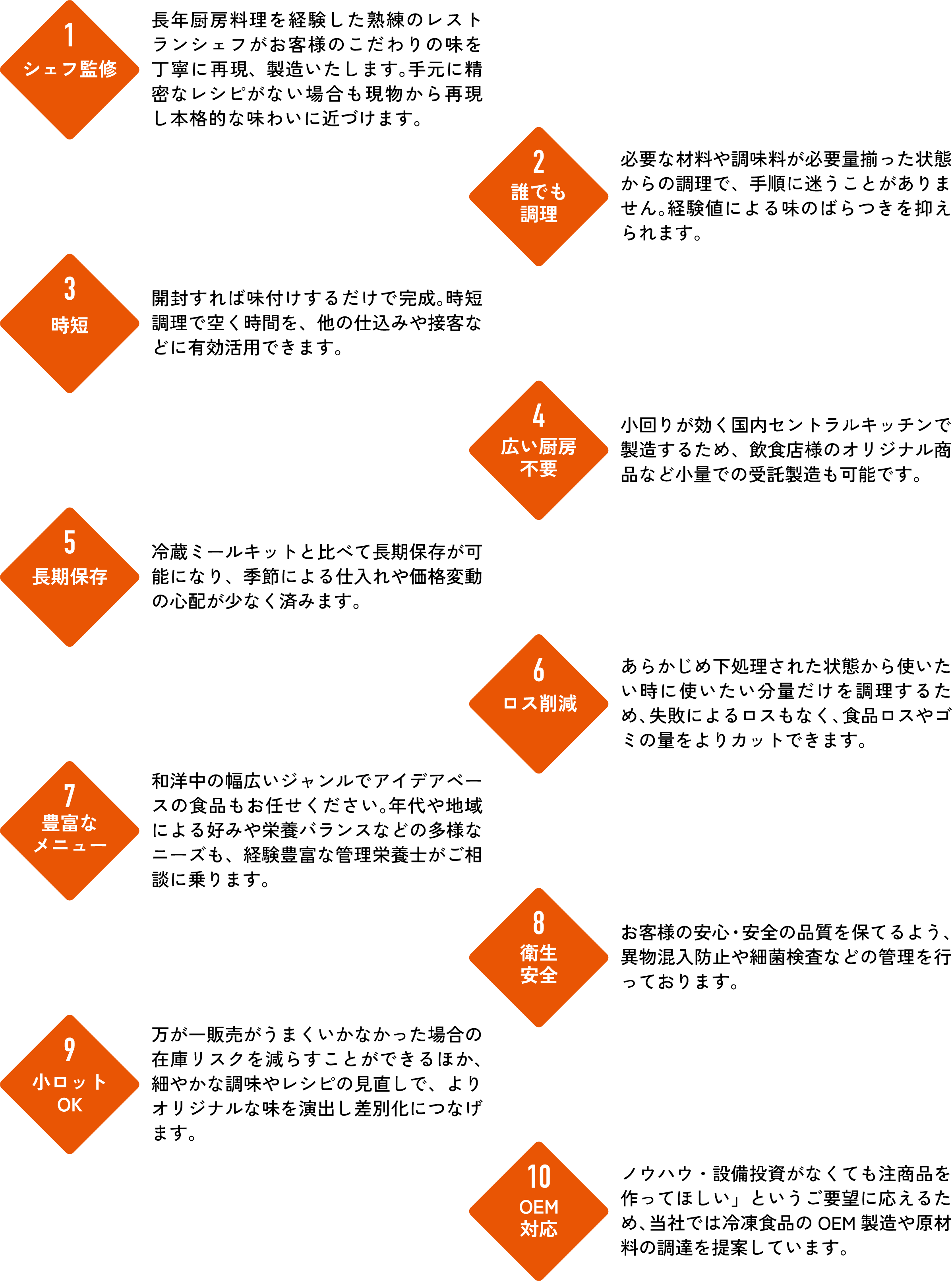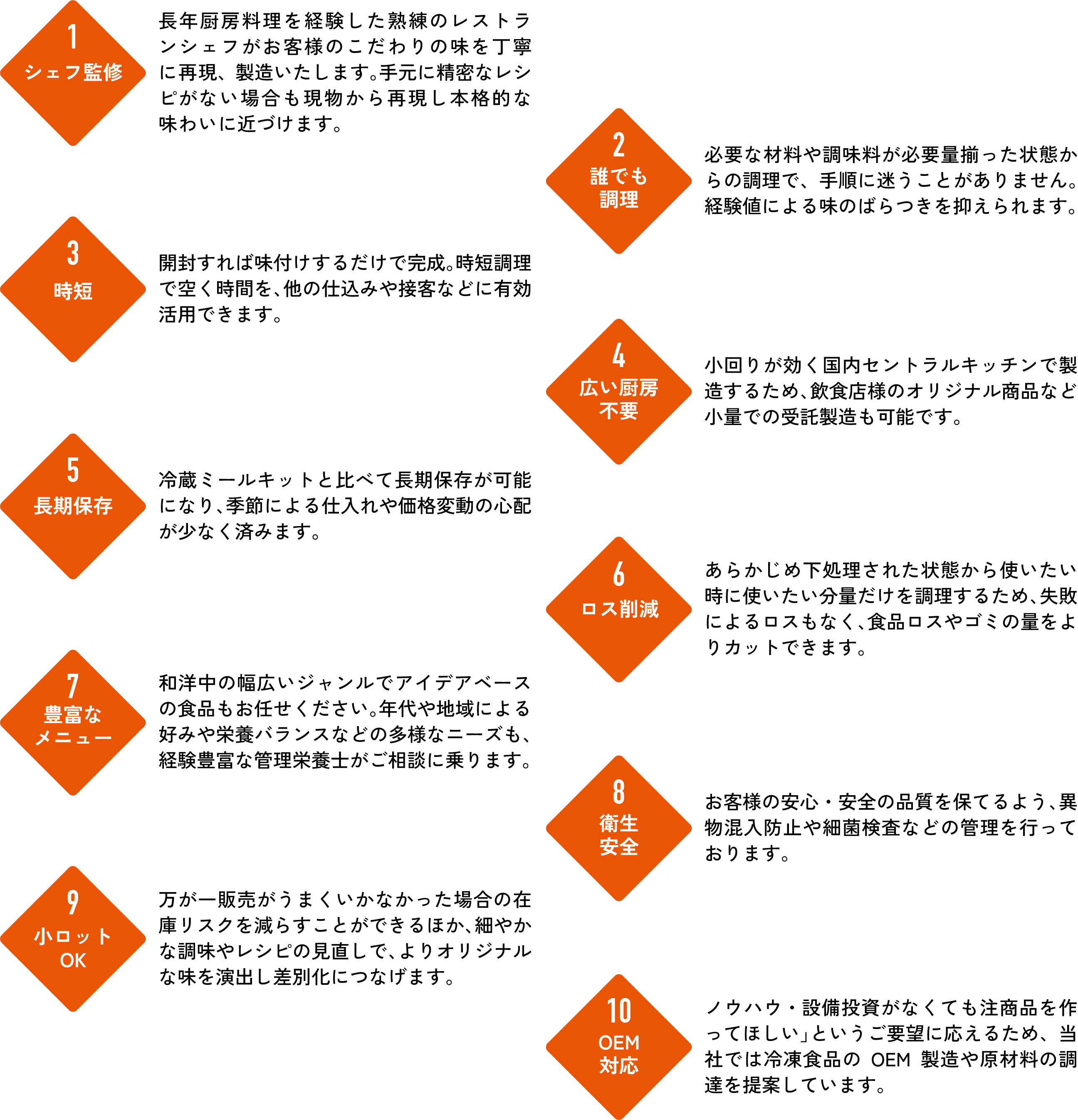 飲食のプロの方々からの「小ロットの特注商品を作ってほしい」というご要望に応えるため、当社では冷凍食品のOEM製造や原材料の調達を提案しています。